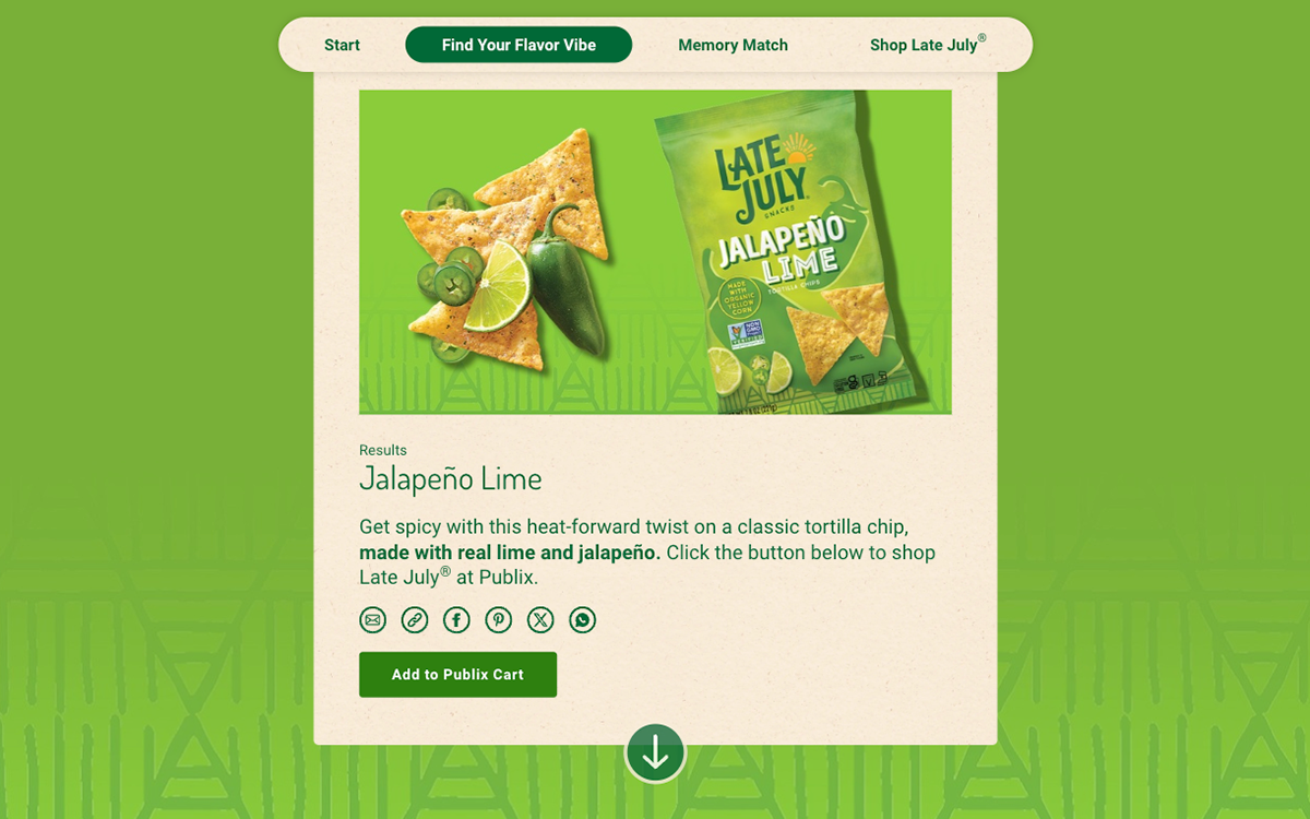 An immersive web experience for Late July's "Amazingly Delicious Snacks" campaign focusing on their flavorful, organic tortilla chips. The website features a personality quiz resulting in a recommended product, a memory match game, and an add-to-cart function driving customers to buy Late July at Publix.